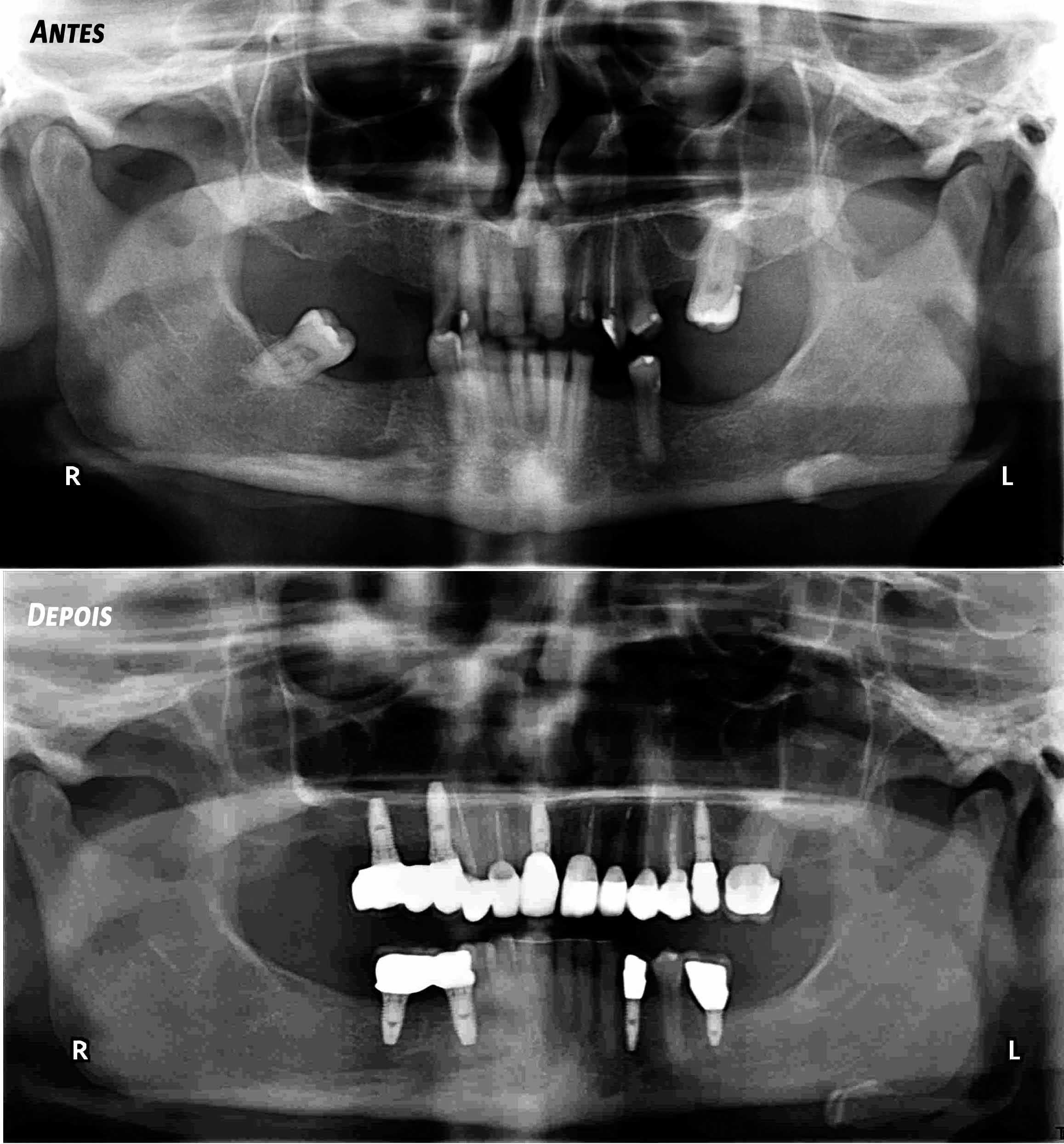 Opção por recobrimento dentário com coroas nos dentes mais destruidos e de facetas naqueles menos atingidos evitando desgastes muito agressivos.